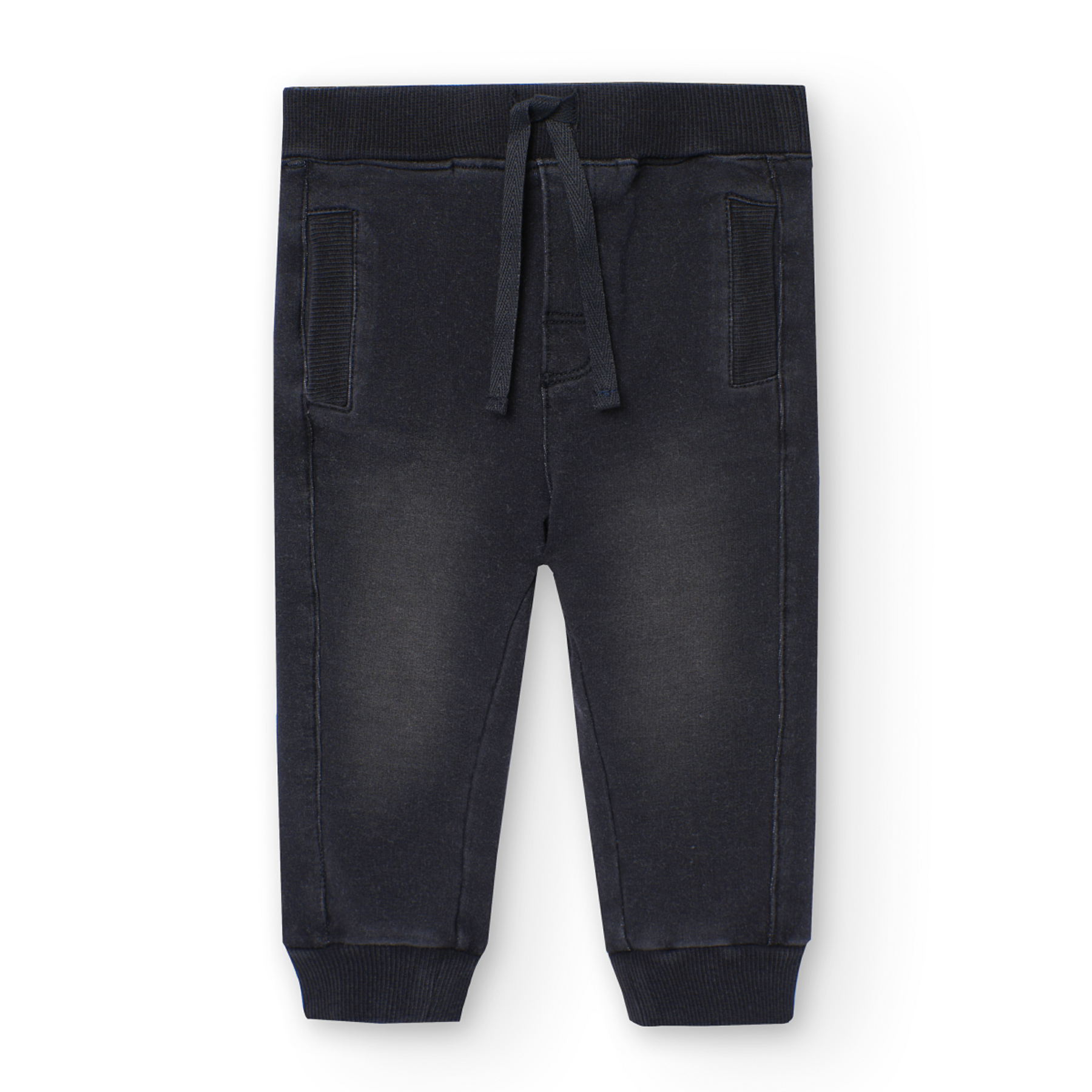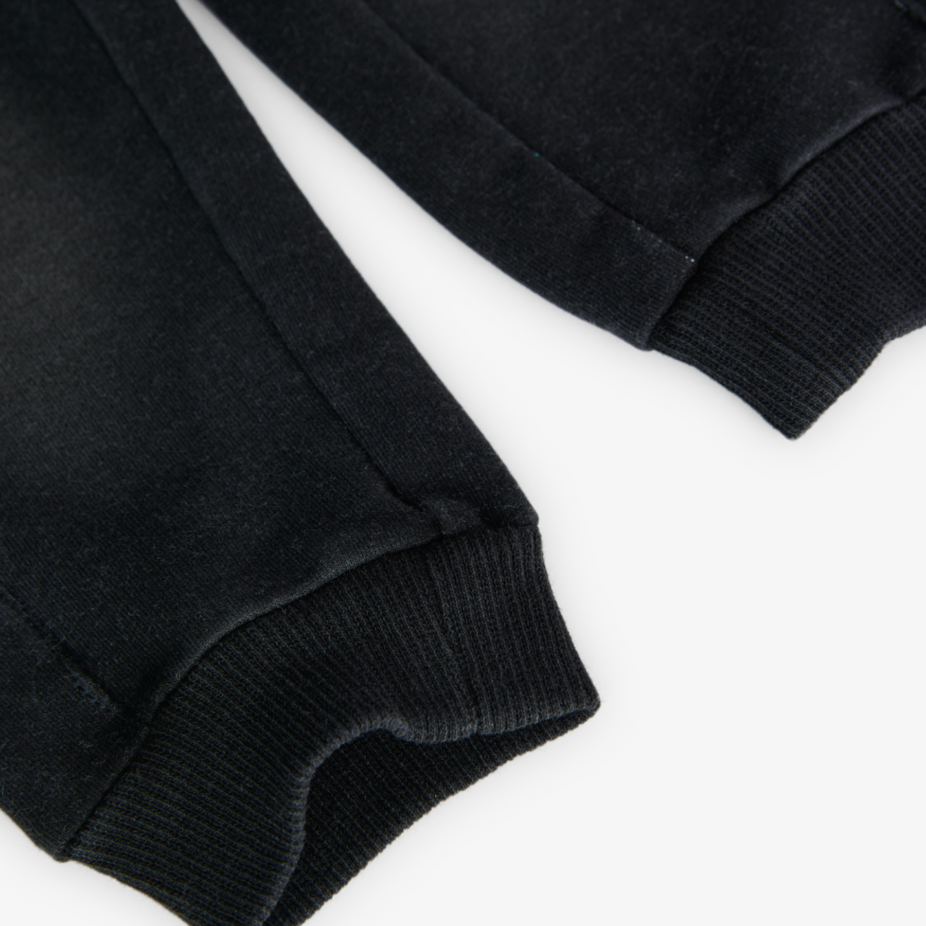 Chlapecké tepláky v černé barvě. Chlapecké tepláky v klasické černé barvě s elastickým pasem na šňůrku a bočními kapsami. Žebrované náplety na nohavicích pro lepší přizpůsobení. Měkký materiál ideální na volný čas. Skvělý společník pro hravé dny.
