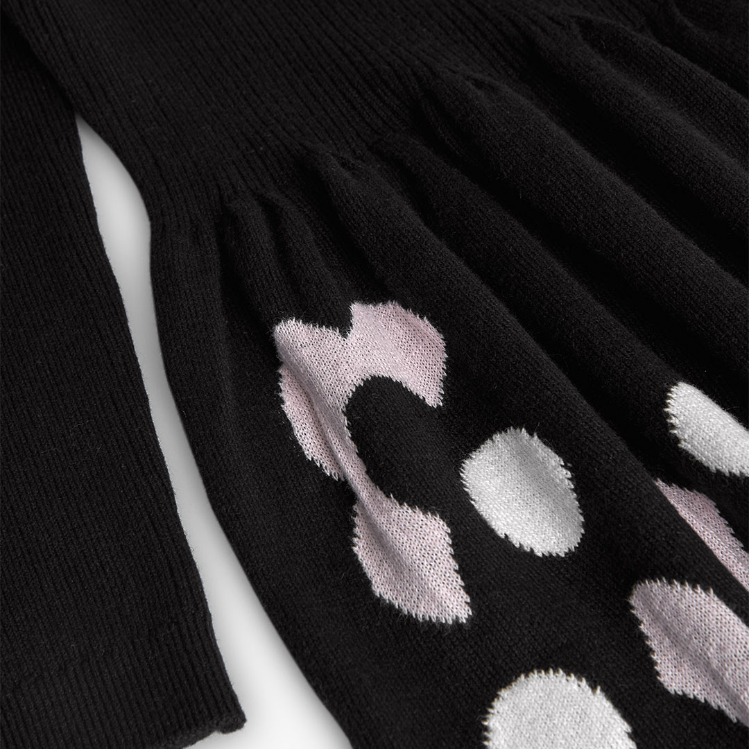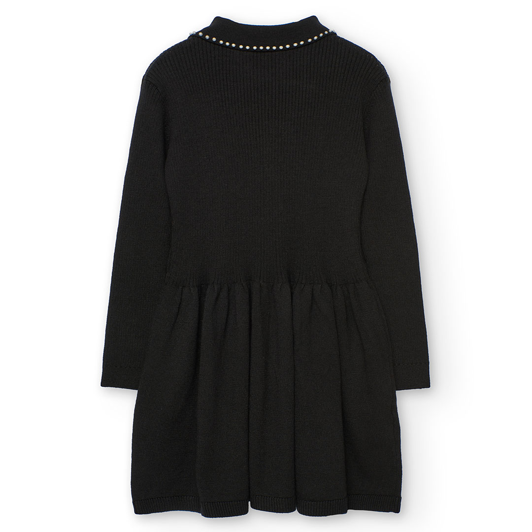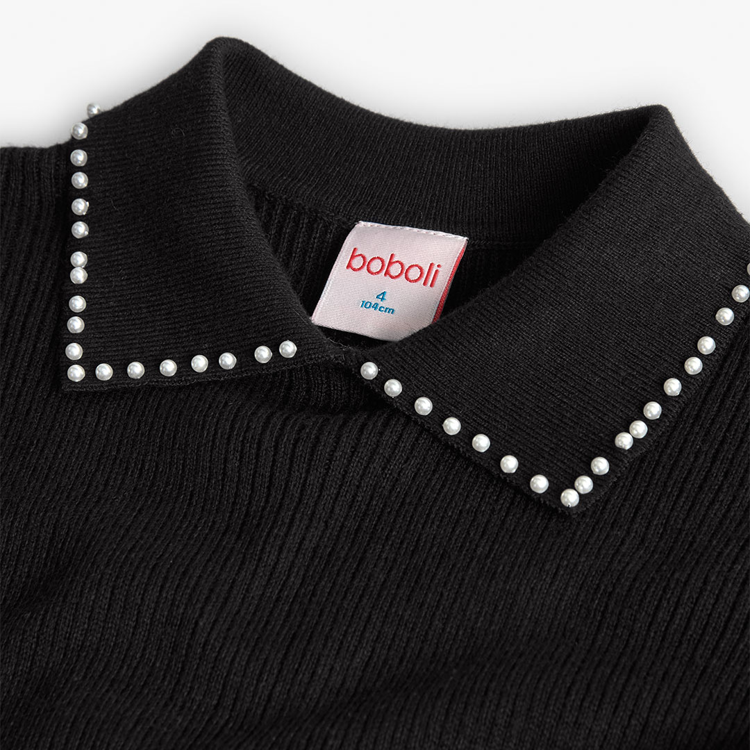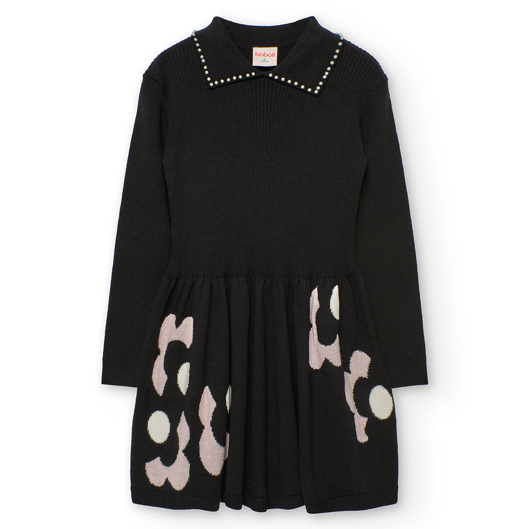 Dívčí černé pletené šaty s límečkem. Pletené dívčí šaty v černé barvě s dlouhým rukávem, zdobené perličkami na límečku a jemným vzorem na sukni v růžových a bílých tónech. Měkký a příjemný materiál zahřeje a zároveň potěší svým slavnostním vzhledem. Ideální volba na oslavy, focení i zimní procházky. Styl, který vykouzlí úsměv.