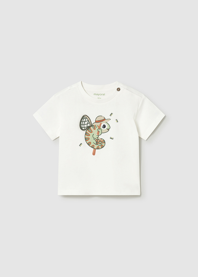 Bílé tričko s chameleonem a lupou. Chlapecké tričko s krátkým rukávem v bílé barvě s ilustrací zeleného chameleona držícího lupu. Hravý detail pro zvídavé kluky, vhodné na jaro a léto.