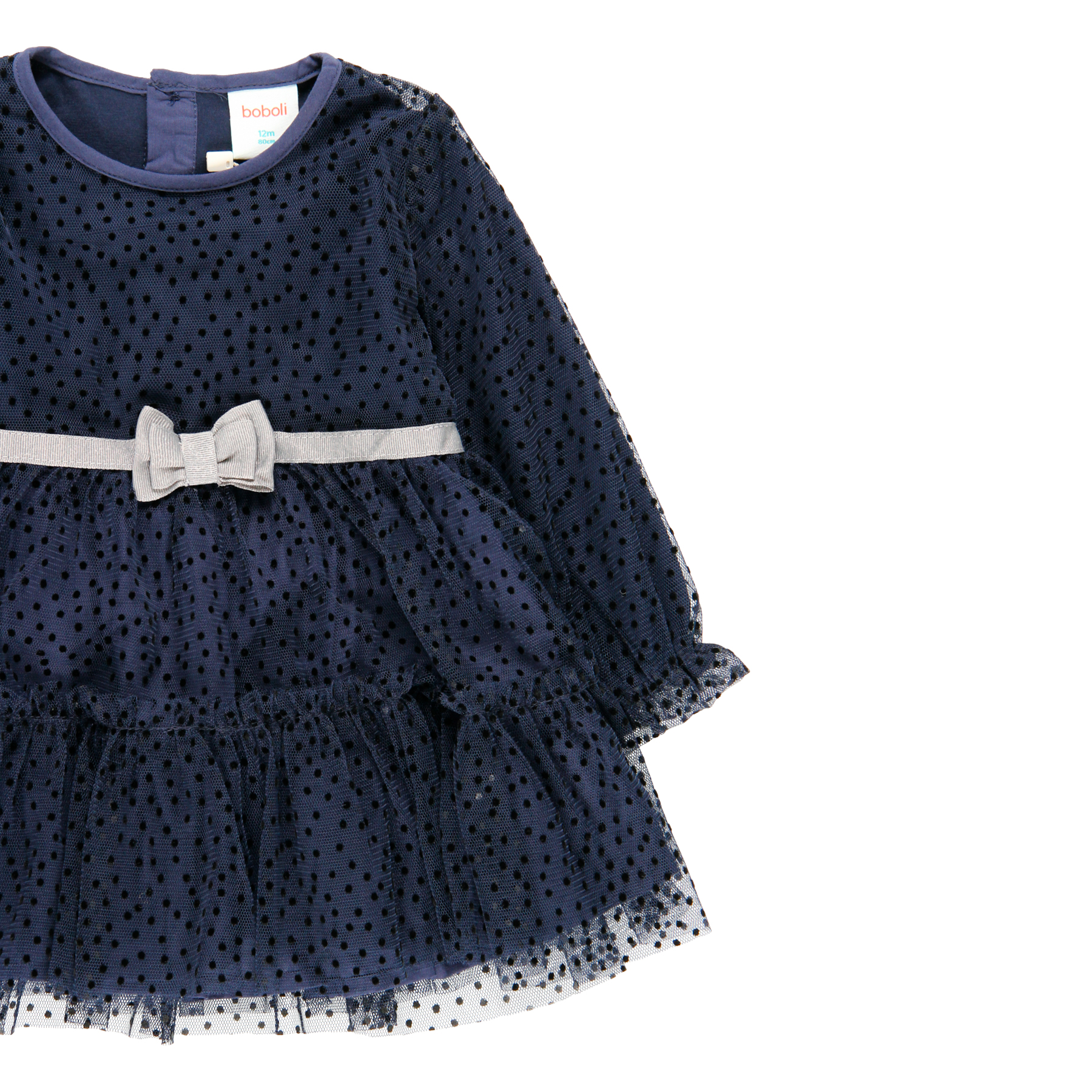 Vestido de niña de tul con estampado de topitos de terciopelo todo en color marino. Se abrocha con botones en la espalda. Lleva un cinturón con lazo de color plata. La prenda va forrada con tejido de popelín a tono. Disponible de la talla 6 meses a 6 años.