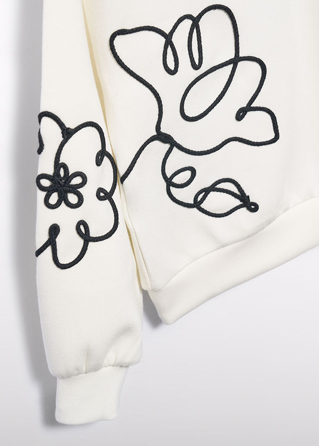 Mikina s originální květinovou výšivkou. Moderní bílá mikina s kulatým výstřihem a dlouhými rukávy. Přední i zadní část zdobí černé květinové motivy vytvořené vyšívanou linií, které působí hravě a stylově. Díky měkkému materiálu je pohodlná na každodenní nošení a žebrované lemy zajistí skvělé padnutí. Snadno se kombin