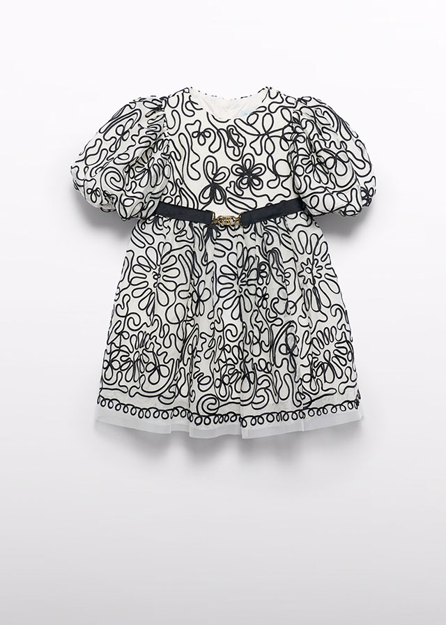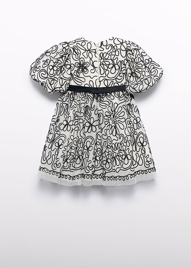 Šaty s originálním květinovým vzorem a páskem. Elegantní dívčí šaty v bílé barvě s výraznou černou květinovou výšivkou. Mají krátké balónové rukávy a odnímatelný pásek s ozdobnou přezkou, který krásně zvýrazní pas. Díky podšívce působí šaty nadýchaně a slavnostně. Ideální volba na oslavy, svátky nebo speciální příležitosti, kde se každá malá slečna bude cítit výjimečně.