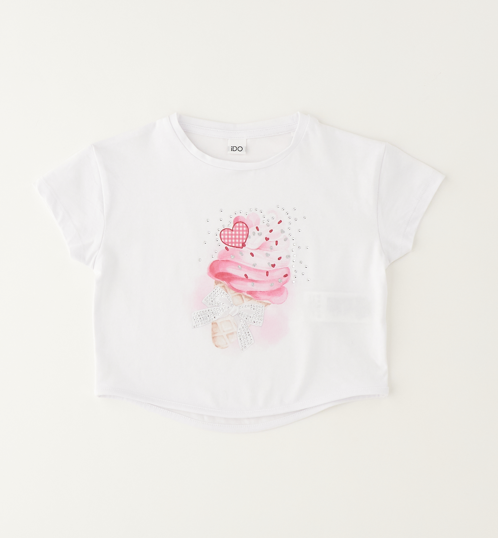 Dívčí bílé tričko se zmrzlinou a kamínky. Bílé dívčí tričko s romantickým motivem růžové zmrzliny, mašle a jemných kamínků. Třpytivé detaily dodávají slavnostní nádech. Ideální k sukni i kraťasům.
