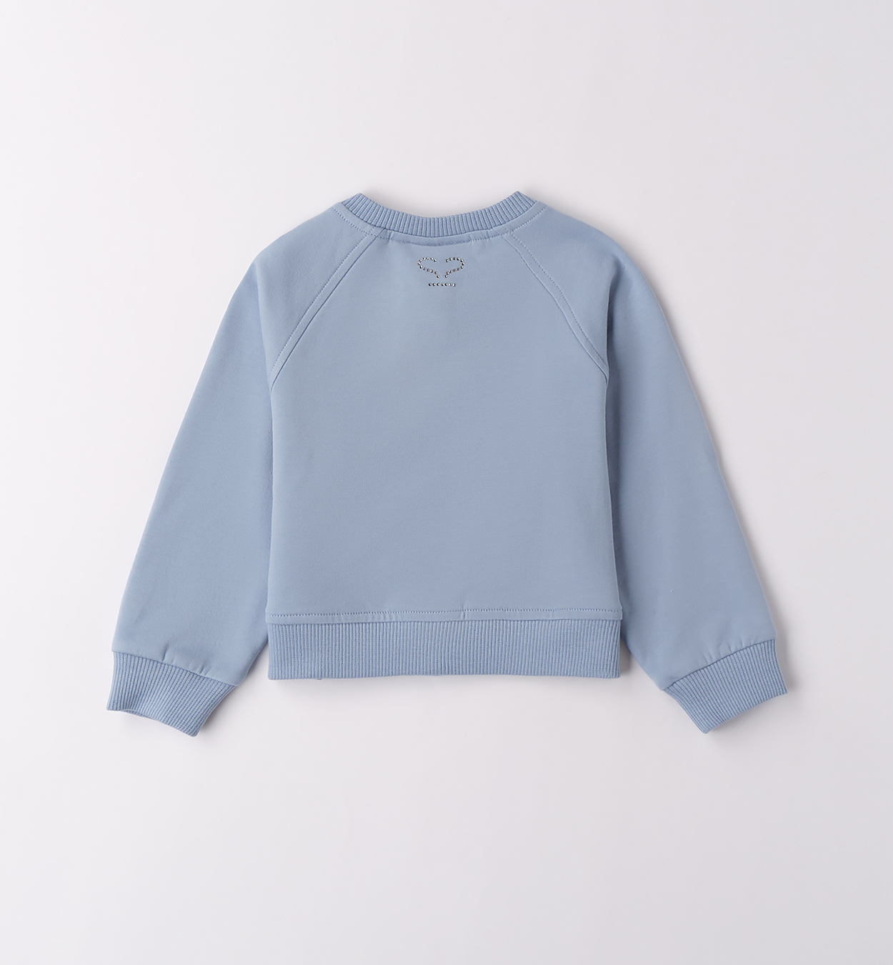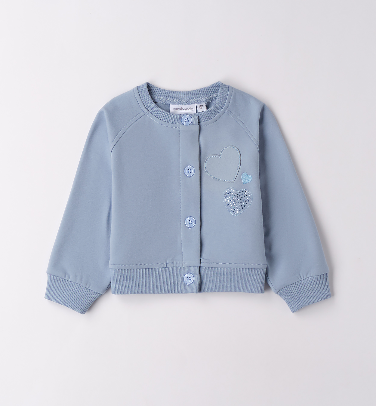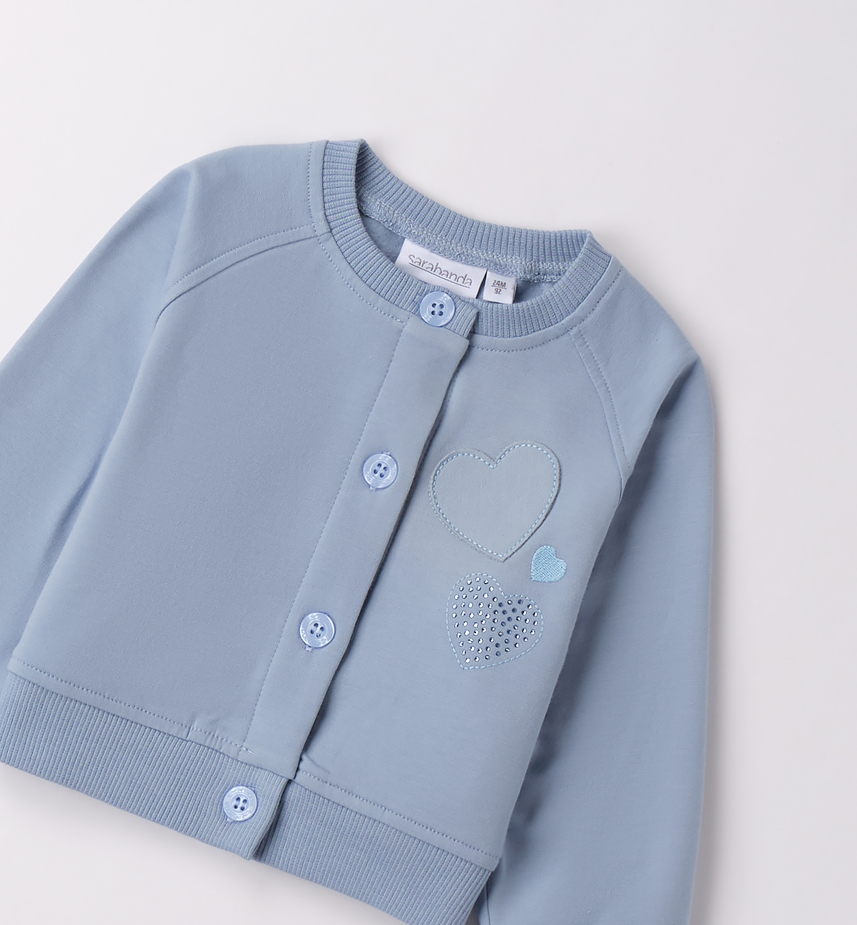 Mikina s jemnými srdíčky a třpytkami. Světle modrá dívčí mikina na knoflíky s jemnou výšivkou tří srdíček, jedno z nich zdobené třpytivými kamínky. Měkký materiál a pohodlný střih zajistí příjemné nošení. Skvělá volba pro každodenní outfit i chladnější dny ve školce.