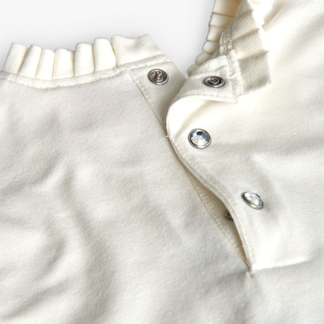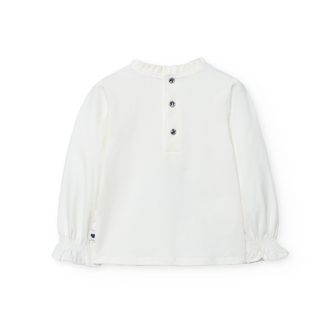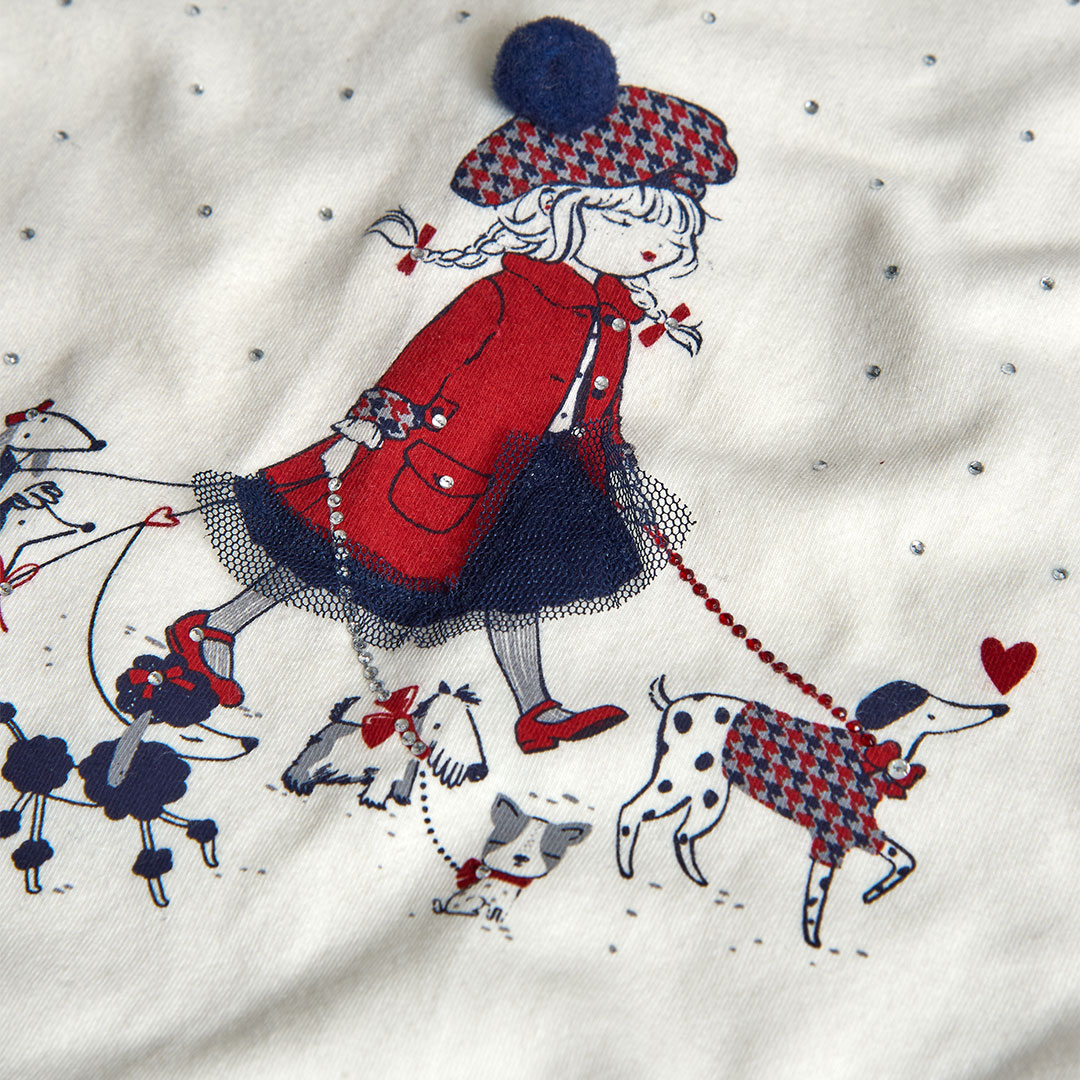 Dívčí tričko s roztomilým potiskem holčičky se psy. Okouzlující dívčí tričko s dlouhým rukávem v krémové barvě, zdobené roztomilým potiskem holčičky se psy. Volánky na rukávech a výstřihu dodávají elegantní nádech. Perfektní volba k sukni nebo kalhotám z nové kolekce.